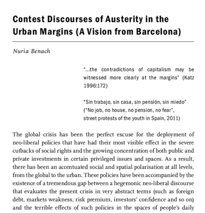 La revista Scripta Nova ha publicado el dossier monográfico «En las fronteras de lo urbano» que contiene parte de los resultados del proyecto “En las fronteras de lo urbano: desposesión, resiliencia y resistencia en espacios urbanos extremos (RESDERES)”. Con artículos de Núria Benach, Anna Clua y Teresa Tapada.